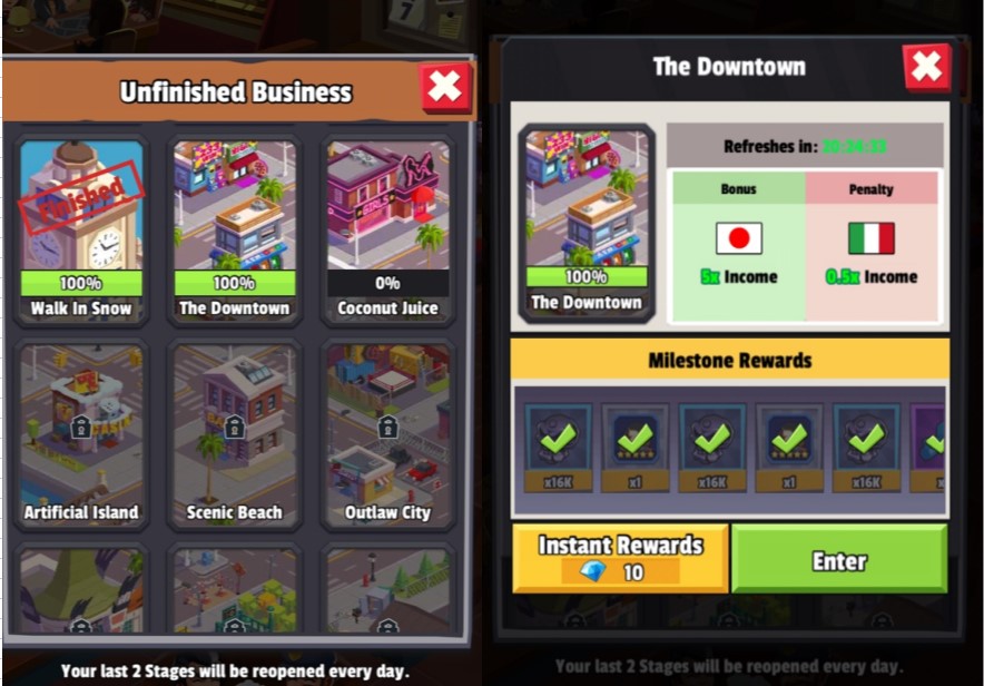 هل أنت عالق في مرحلة معينة؟ لا تقلق داخل عمل غير منتهي يتم إعادة فتح آخر مرحلتين لعبتهما تلقائيًا كل يوم. هذا يسمح لك بجمع مكافآت جديدة كل يوم!